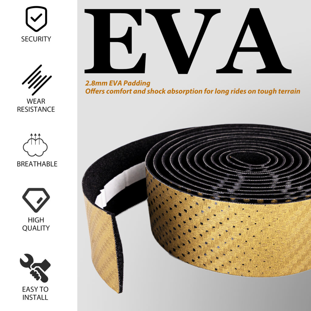 This tape blends performance with standout style thanks to its striking black-and-gold carbon fiber finish. The PU+EVA structure ensures strong grip, impact absorption, and long-lasting comfort whether you’re riding road or gravel.
