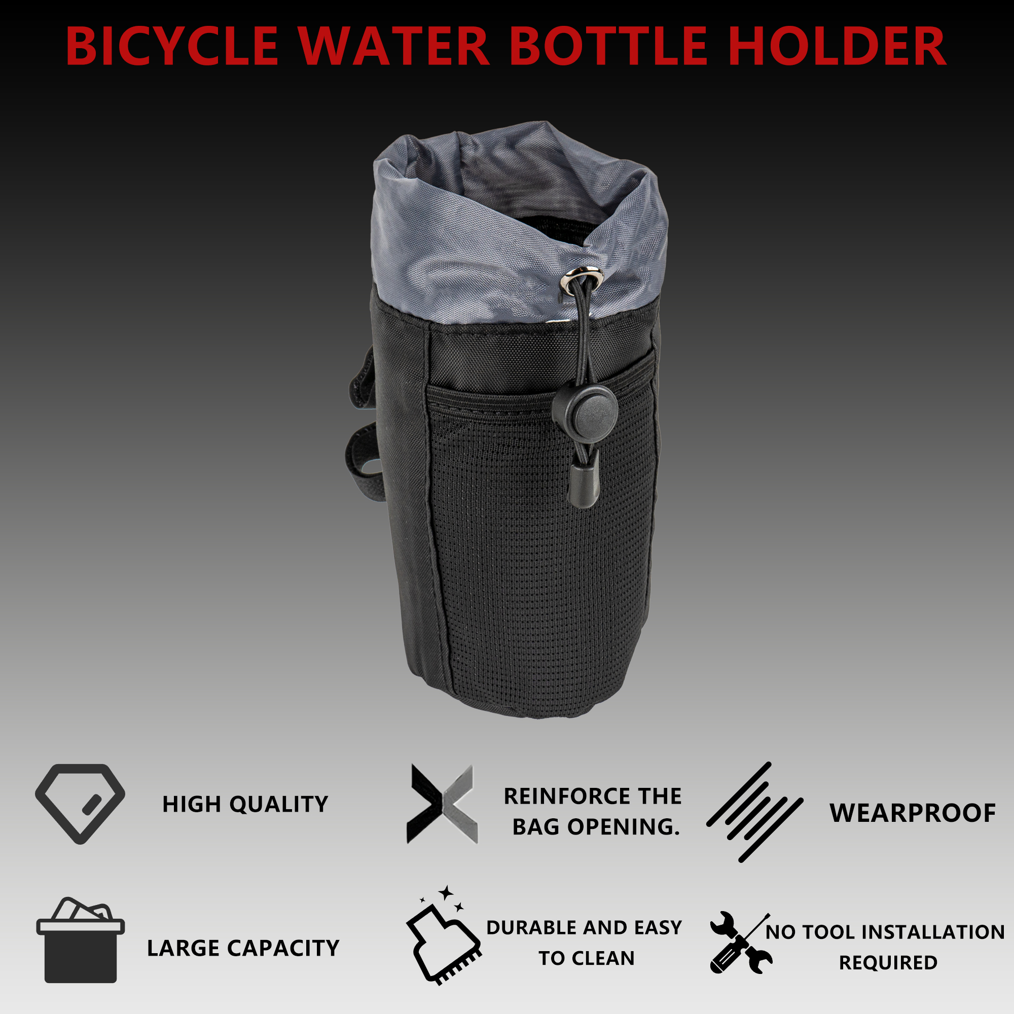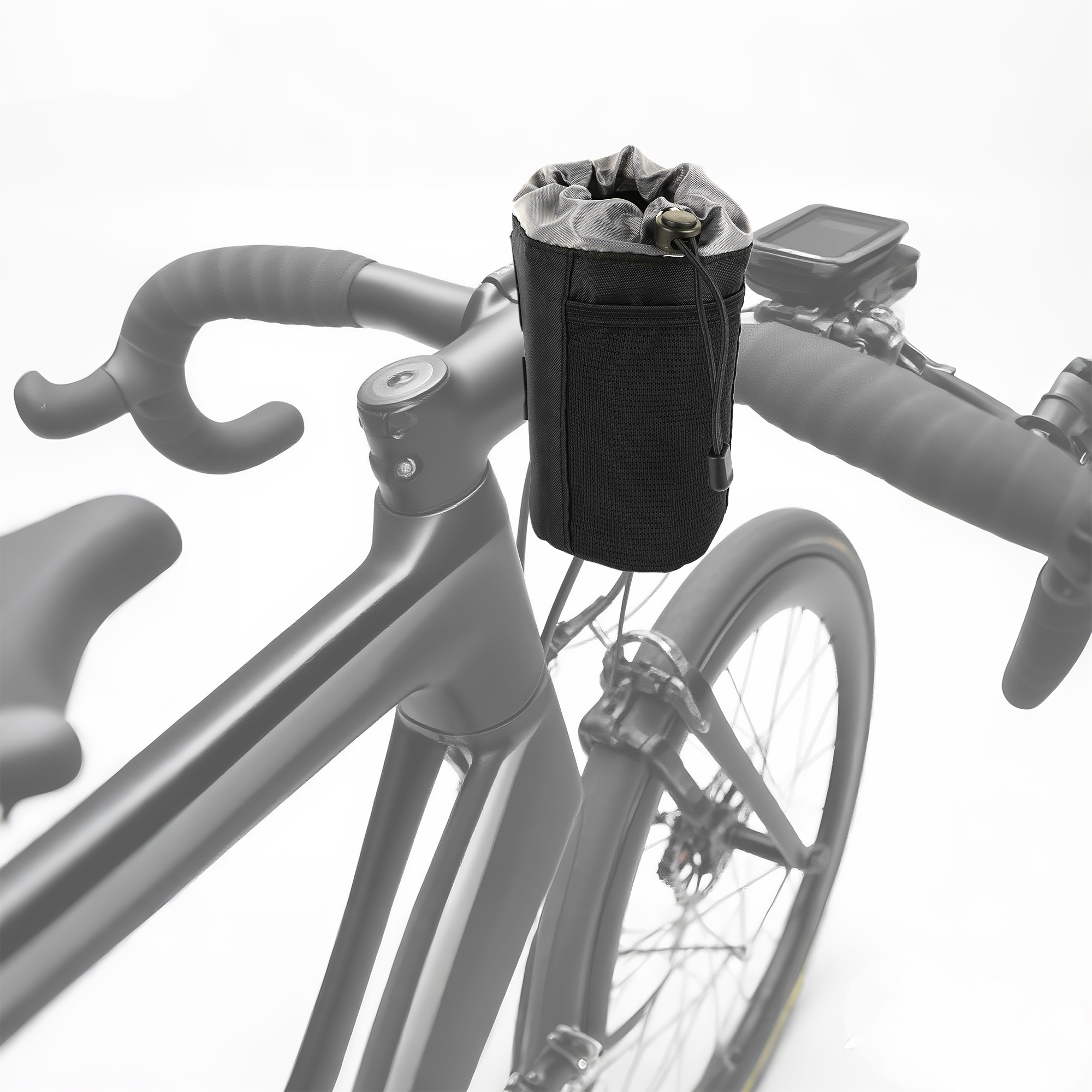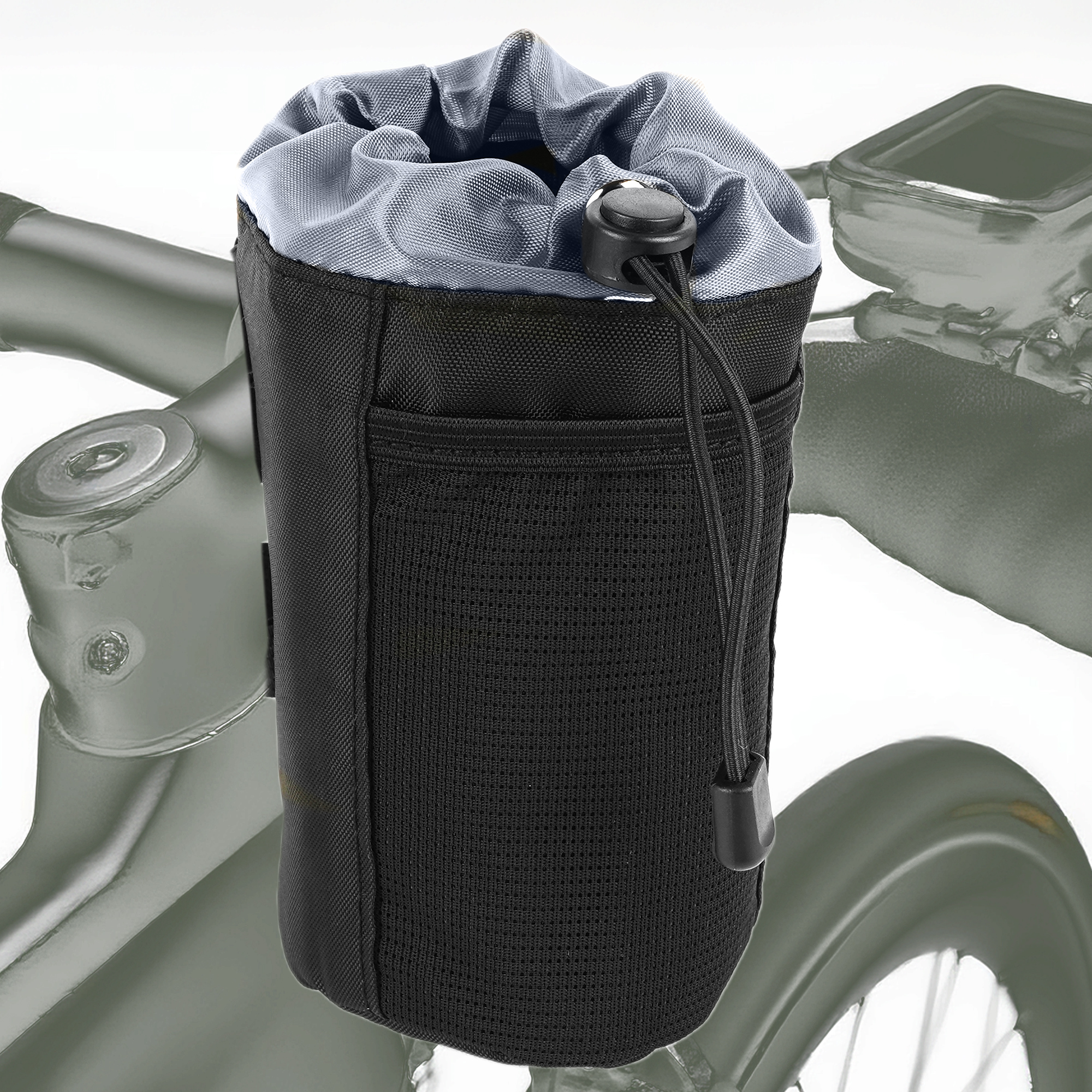 Secure drawstring collar keeps bottles, cans or coffee tumblers from bouncing out on rough roads and trails; fits most standard bike bottles.