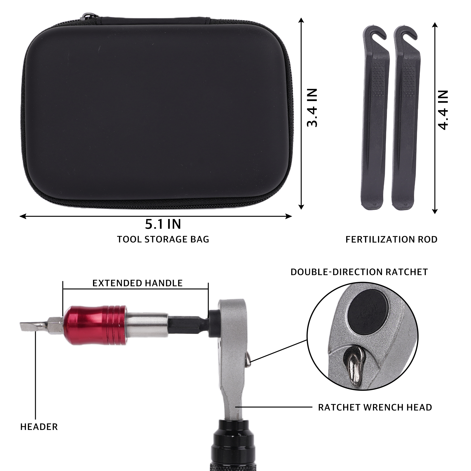 The tool kit comes with a high-quality storage bag, providing extra space for organized storage. Keep more your tools neatly arranged, including tire levers, valve caps, and the ratchet wrench, preventing misplacement and saving space in your bag or bike frame.