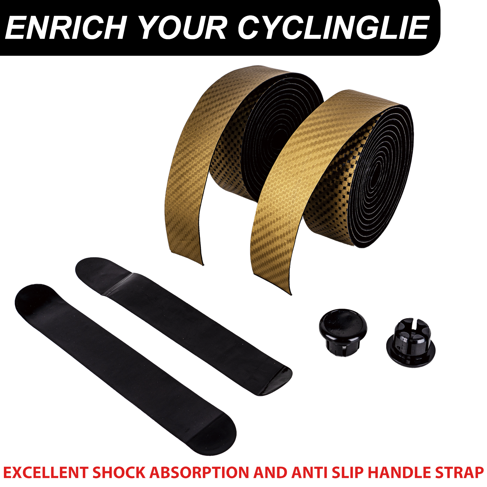 RidingRush Non-Slip EVA Handlebar Tape, Bike Grip Tape Carbon Fiber (Black & Gold) – PU Leather for Road and Gravel Bikes – Lightweight Grip Tape with End Plugs